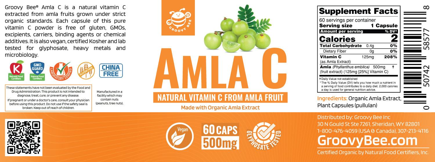Derived from fresh amla fruits grown in India under strict organic standards, Groovy Bee® Amla C Capsules deliver the wholesome goodness of pure, lab-verified vitamin C. Our premium amla extract supplement is completely non-GMO, non-China and is extensively lab tested for glyphosate, heavy metals and microbiology to ensure cleanliness and purity. You can get 125 mg of highly bioavailable vitamin C from a single serving of Groovy Bee® Amla C Capsules (208% of the Daily Value).