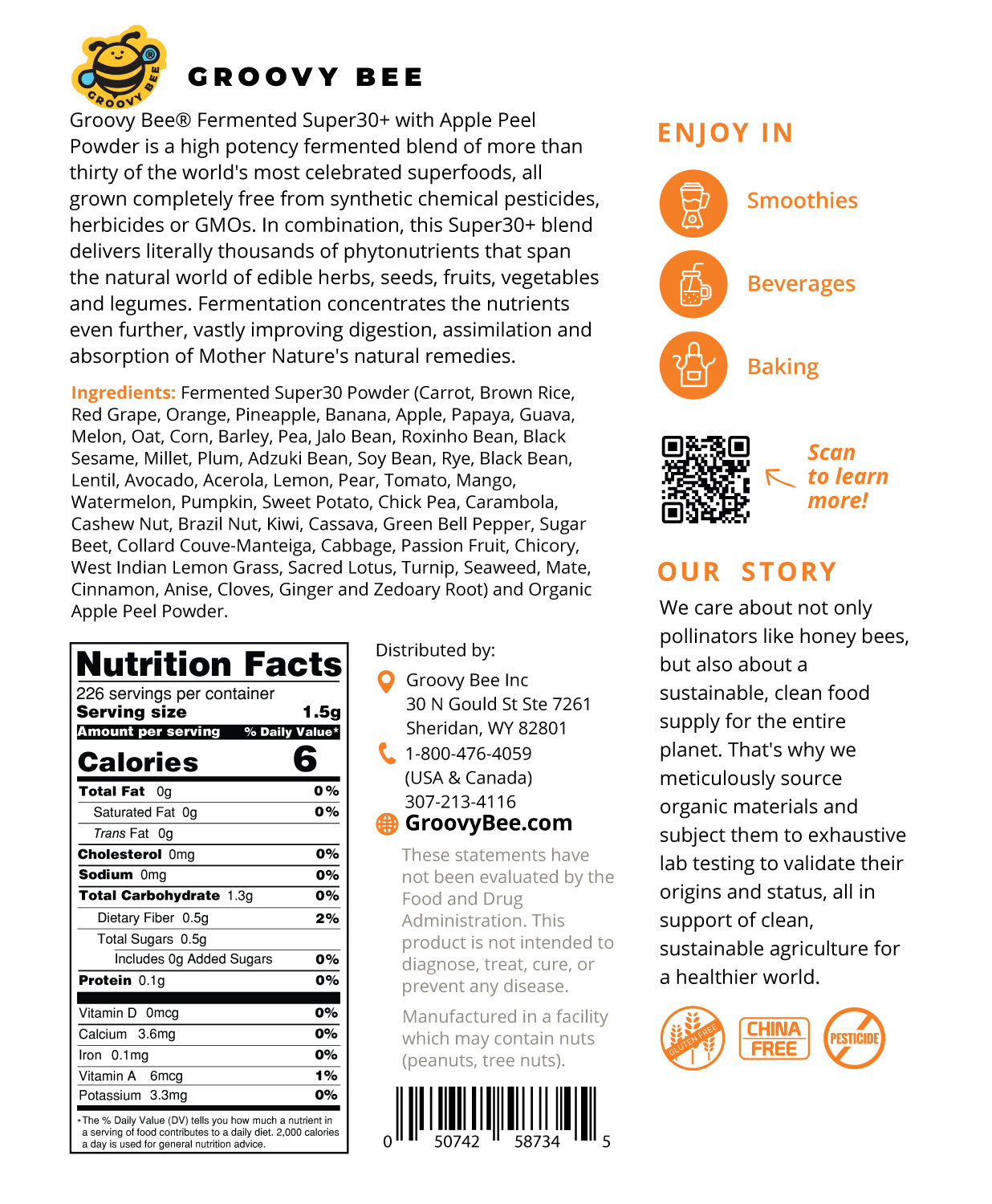 Now infused with nutrient-dense organic apple peel powder, Groovy Bee® Fermented Super30+ contains the following fermented superfoods: