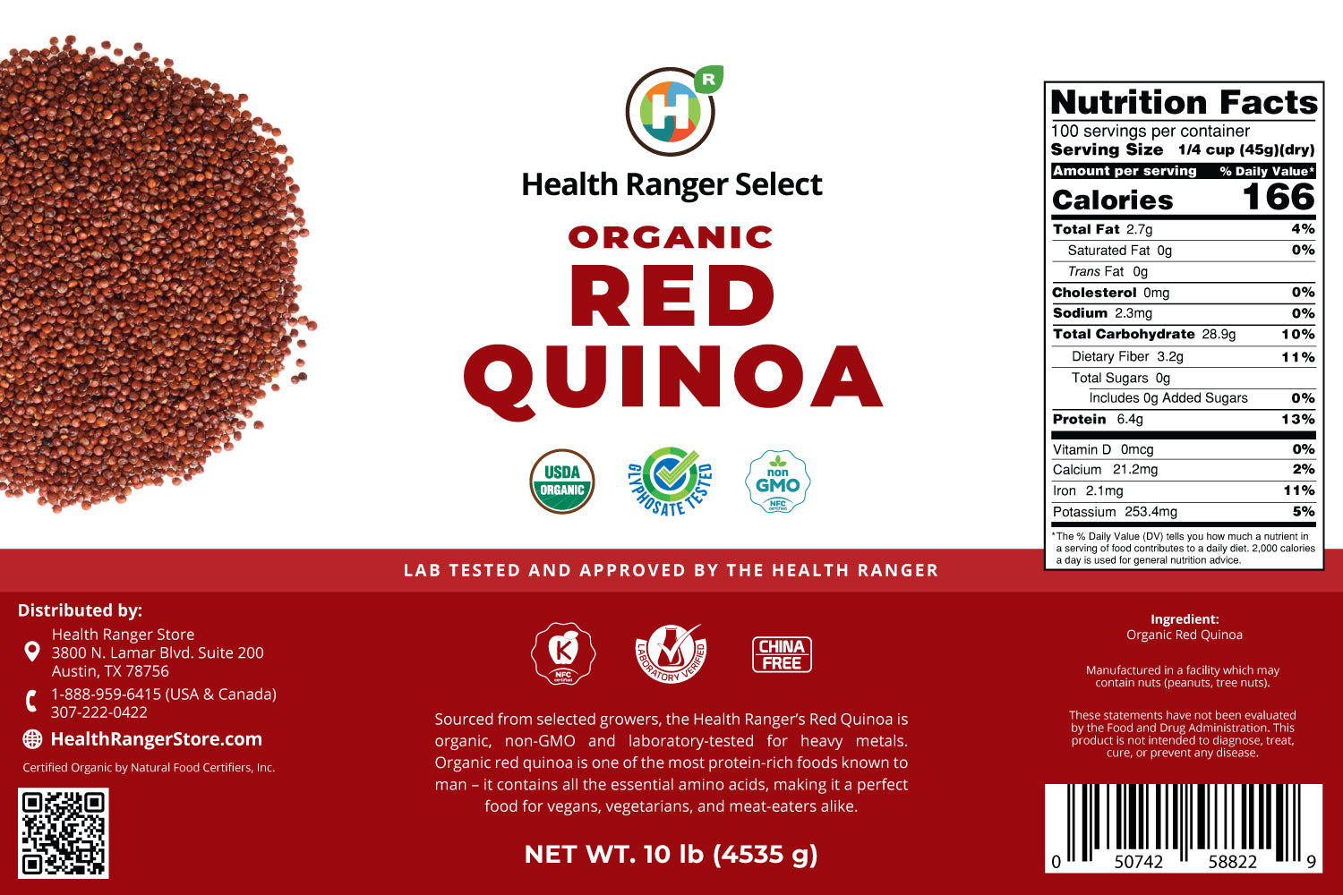 Health Ranger Select Organic Red Quinoa is vegan, non-GMO, non-China and certified Kosher and organic. It contains no gluten and is extensively lab tested for glyphosate, heavy metals and microbiology. With its crunchy texture and nutty flavor, our premium red quinoa variety is highly versatile and can be mixed with almost anything.